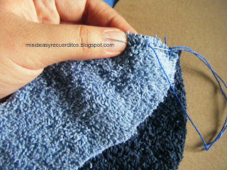 1. Agranda el molde e imprime. Pásalo con calcante a un cartón ubícalo sobre la toalla dejando 1 cm para la costura. La base del cuerpo, cara, cuello y manos con la toalla azúl rey y la boca y la panza con la toalla azúl marino.